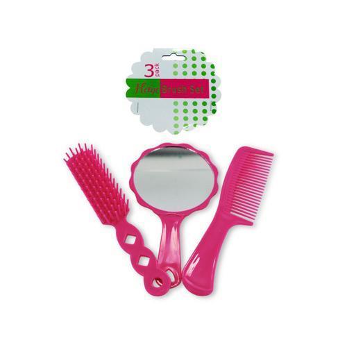 Case of: 12Colors: pinkMaterials: glass, plasticGirls will love this brush and beauty set featuring 1 pink handled comb, 1 pink hairbrush and 1 pink handheld mirror. Approximate measurements: brush 7" long, mirror 6 1/2" long and comb 7" long. Comes packaged in a poly bag with header card.