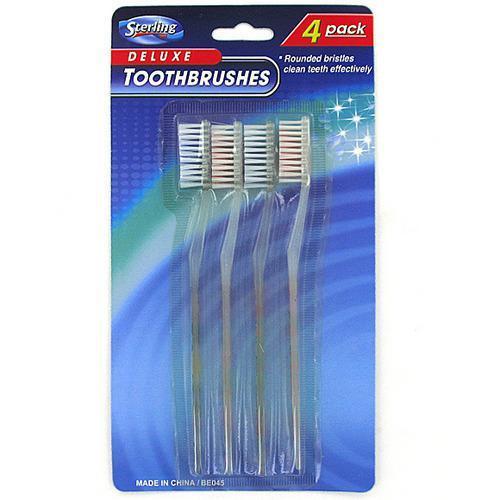 4 deluxe toothbrushes. Rounded bristles clean teeth effectively. 7"inch handle with nylon bristles. Comes in blister package with UPC code.