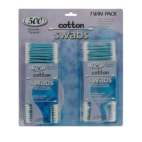 This twin pack of cotton swabs is a super value! Each set has 250 double-ended cotton swabs. Made with soft tips and flexible stems. Swabs come in color assortments: pink, green, blue and yellow. Package turns into an easy open and close container so swabs stay organized in one pack. Do not insert into the inner ear or nose canal. Each cotton swab measures 2 3/4"