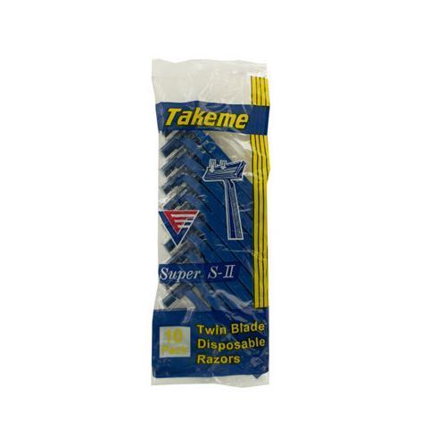 Get a clean, close shave with this 10-pack of Twin Blade Disposable Razors. Twin blades provides a smooth, comfortable shaving experience. Each razor measures approximately 4" x 1.5". Comes packaged in a hanging poly bag.